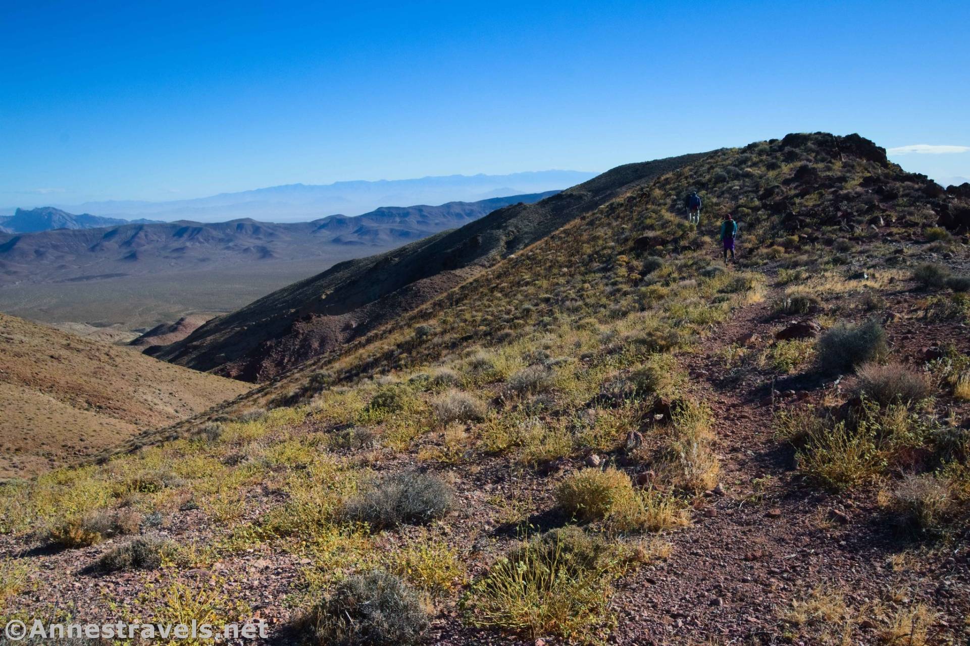 As you walk along the ridgeline, enjoy views to Dantes View Peak and Perry Peak, Badwater Basin, the Panamint Mountains, Pyramid Peak and other summits of the Funeral Mountains, Charleston Peak far to the east in Nevada, and many summits in the Black Mountains and Greenwater Range.