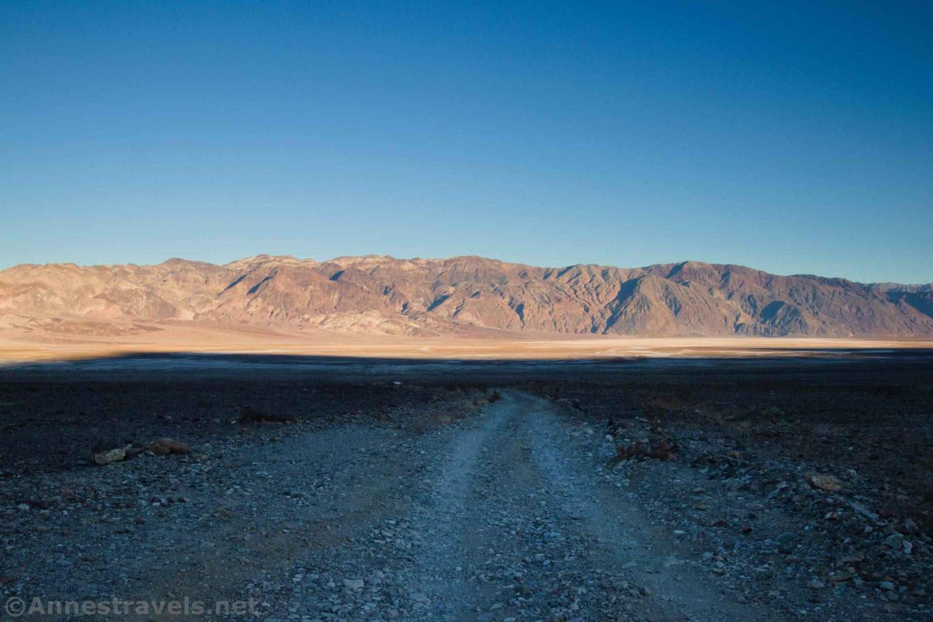 0.0 Trail Canyon Road Junction on the West Side Road (-255ft.). Turn up Trail Canyon. The road is rough, rocky, and steep but manageable for high clearance, 2WD vehicles for the first four miles up to the top of the alluvial fan, after which 4×4 is required. Be sure to look back down the road, as the views out over Devils Golf Course and the Black Mountains are excellent, especially in the afternoon. (36.303036°, -116.890578°)